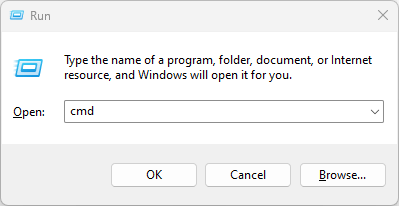 Để kiểm tra tình trạng ổ cứng bằng WMIC, trước hết, bạn hãy nhấn tổ hợp phím Windows + R để mở cửa sổ Run. Tiếp theo, bạn nhập từ khóa cmd rồi nhấn OK để mở cửa sổ Command Prompt.