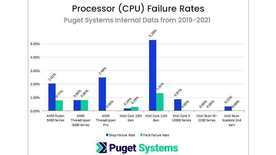 Nhìn chung, Puget cho rằng CPU AMD có tỷ lệ lỗi cao hơn Intel, ngoại trừ bộ xử lý Rocket Lake dành cho người tiêu dùng. Điều này có vẻ kỳ lạ trong bối cảnh nó thua cả bộ xử lý thế hệ thứ 10 ra mắt trước đó.
