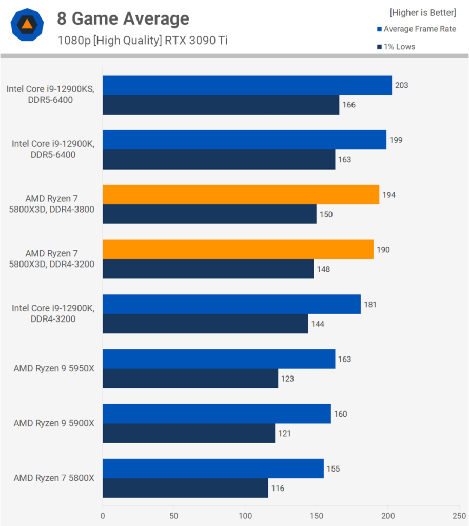 Từ thử nghiệm 8 trò chơi, có thể thấy rằng Ryzen 7 5800X3D nhanh hơn một chút so với 12900K khi sử dụng cùng bộ nhớ DDR4.