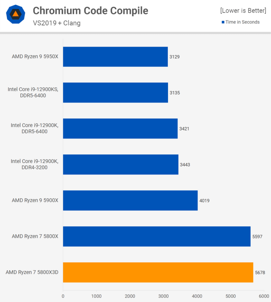 Hiệu suất của 5800X3D trong Chromium Code Compli tương tự như 5800X. Sự khác biệt là rất nhỏ, chỉ có 1%.