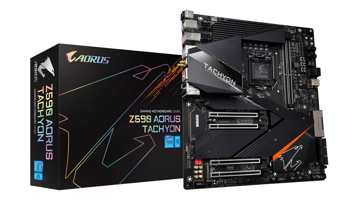 Gigabyte vừa cho ra mắt bo mạch chủ Z590 AORUS TACHYON, với bộ xử lý Intel® Core™ i9 11900K thế hệ thứ 11 mới nhất và bộ tản nhiệt bằng nitơ lỏng LN2 lập kỷ lục ép xung hàng đầu thế giới với xung nhịp 7314MHz, cũng như phá kỷ lục thế giới của Super Pi 1M và Super Pi 32M. Bo mạch chủ GIGABYTE Z590 AORUS TACHYON được trang bị nhiều chức năng được thiết kế cho các tay ép xung hạng nặng, hứa hẹn mang lại xung nhịp cao hơn với thao tác dễ dàng hơn, khẳng định vai trò hàng đầu của GIGABYTE trong việc ép xung trên bo mạch chủ Z590.