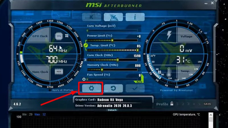 Bước 1: Khởi động công cụ MSI AfterBurner > Chọn Cài đặt (biểu tượng hình bánh răng) để vào bảng Setting.