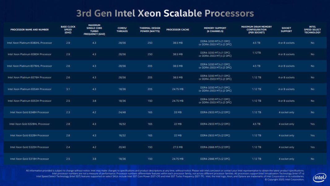 Intel Xeon Scalable thế hệ thứ 3 và Intel Optane 200 series đã được bán ra cho khách hàng từ bây giờ. Facebook đã thông báo rằng các bộ xử lý Xeon Scalable thế hệ thứ 3 là nền tảng của các máy chủ OCP (Open Compute Platform) mới nhất và các nhà cung cấp dịch vụ đám mây (CSP) đứng đầu khác bao gồm Alibaba, Baidu and Tencent, đã tuyên bố họ sẽ sử dụng các bộ xử lý thế hệ kế tiếp.