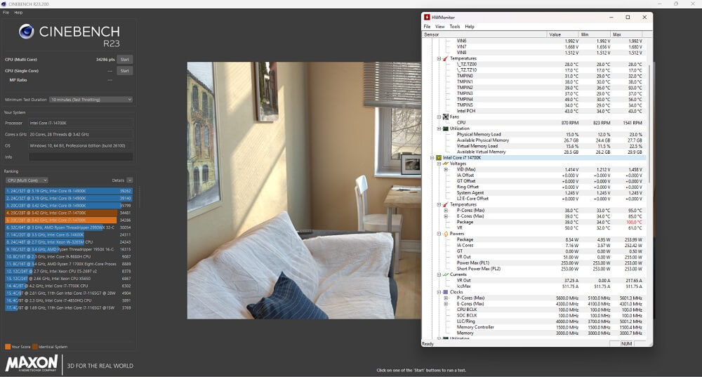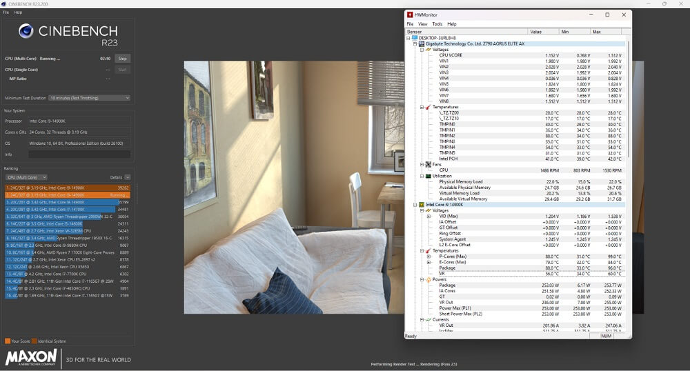 - Kiểm tra nhiệt độ với I9-14900K chạy Cinebench R23