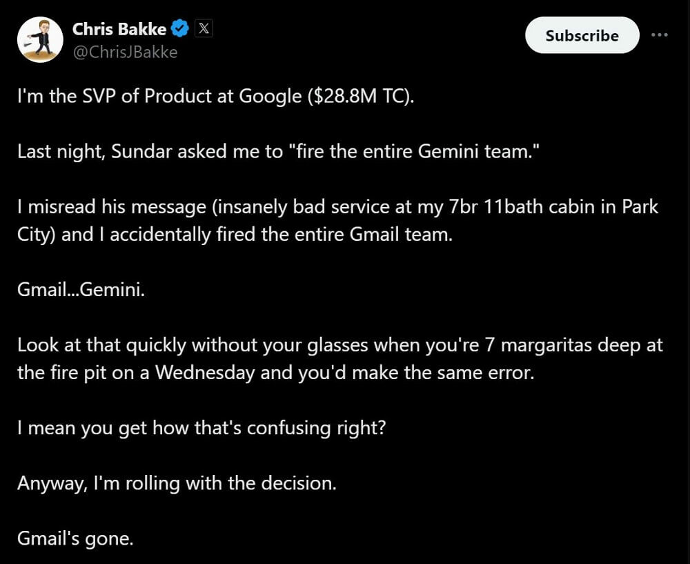 Thông báo giả mạo được đăng tải bởi Chris Bakke, một cựu nhân viên Google và là người thường xuyên có những thông tin đùa giỡn trên mạng xã hội. Bakke đã giả danh thành Giám đốc Sản phẩm Cấp cao tại Google (SVP of Product at Google) và tuyên bố ông được CEO Sundar Pichai yêu cầu đóng cửa nền tảng AI Gemini, nhưng thay vào đó lại vô tình đóng cửa Gmail.