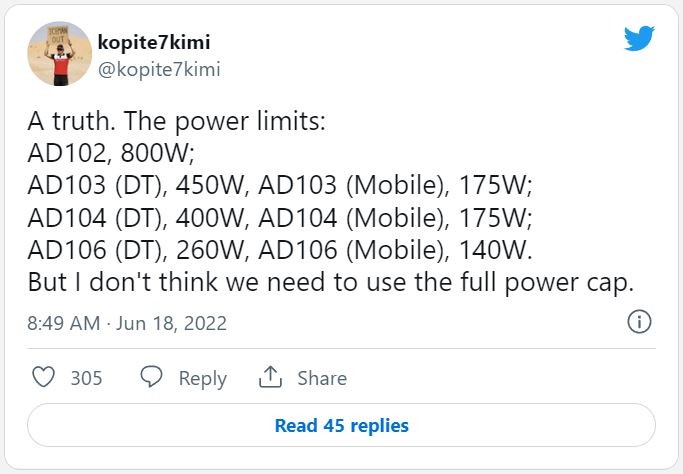 Người chuyên tiết lộ thông tin kopite7kimi, người đã khẳng định các thông số kỹ thuật của Ampere nhiều tuần trước đã cập nhật dự báo của mình về giới hạn công suất của RTX 40 Ada Lovelace. Điều quan trọng cần lưu ý là giới hạn công suất không giống như TDP hoặc TBP; đây là một giới hạn chỉ phát huy tác dụng khi có liên quan đến ép xung. Tuy nhiên, đây vẫn là một thông tin tham khảo tốt cho việc tiêu thụ điện năng.