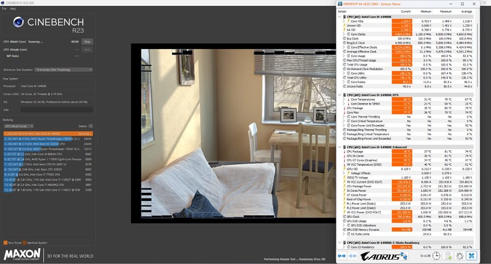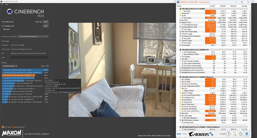 - I5-14600K cho kết quả với BIOS mặc định vào khoảng ~24800 điểm, power package ~208W, nhiệt độ vào khoảng 83°C, khi Undervolt, kết quả cho ra ~24400 điểm, Power package ~ 181W, nhiệt độ trong quá trình benchmatk cao xấp xỉ 73°C