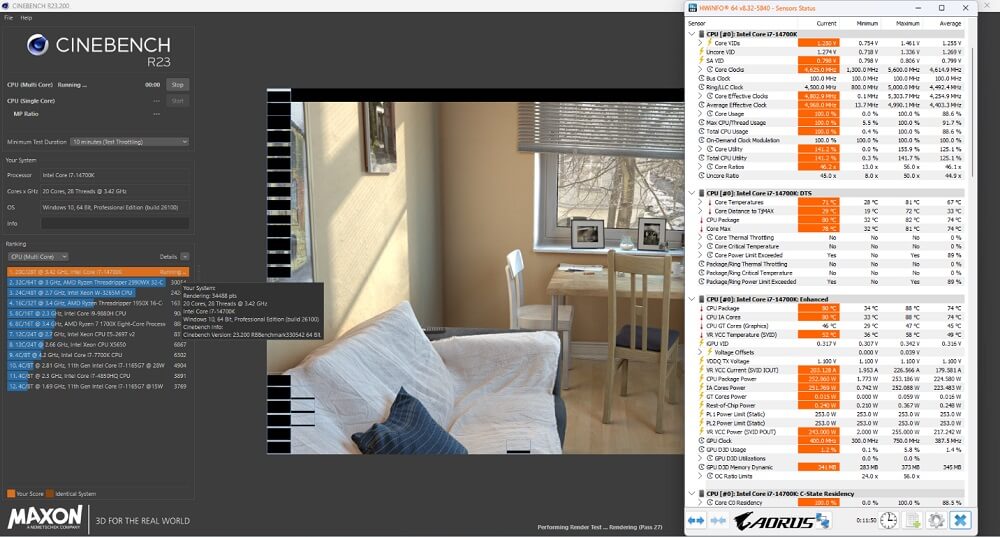 - I7-14700K với BIOS mặc định, điểm số cho ra khoảng ~35600 điểm, power package khoảng ~300W, nhiệt độ khoảng 87°C, khi đã Undervolt kết quả ~34400 điểm, Power package ~ 253W, nhiệt độ trong quá trình benchmark vào khoảng 77-80°C
