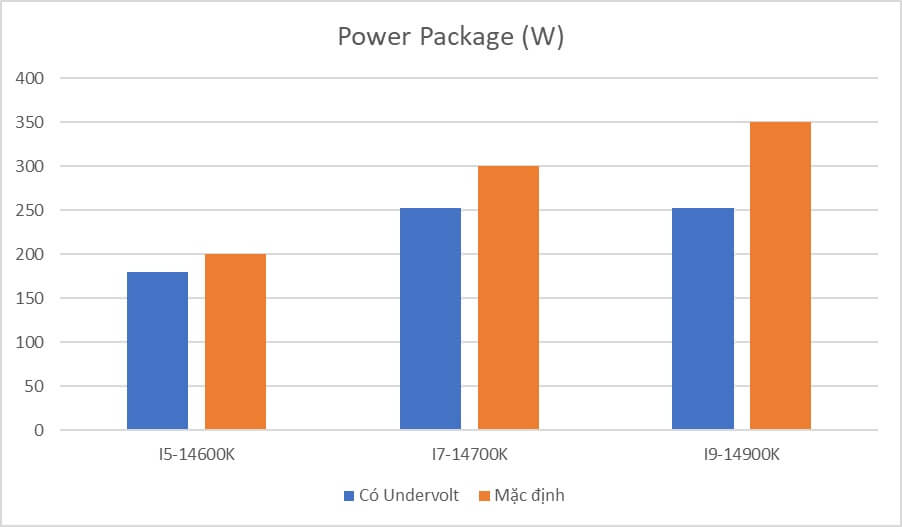 - I9-14900K với BIOS mặc định cho ~40800 điểm, Power package khoảng ~350W, nhiệt độ khá cao, vào khoảng 94°C, khi có undervolt kết quả là ~39600 điểm, Power package vào khoảng ~ 253W, nhiệt độ trong quá trình benchmark vào khoảng 80-83°C