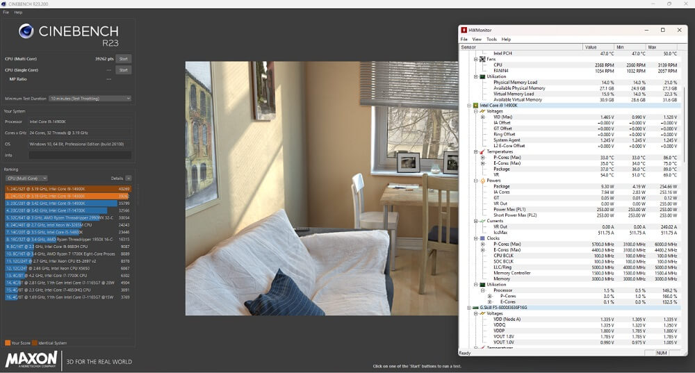 Khi có undervolt kết quả là ~39200 điểm, Power package vào khoảng ~ 254W, nhiệt độ trong quá trình benchmark vào khoảng 84-86°C.