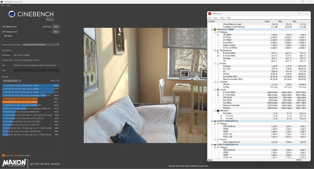 Khi Undervolt, kết quả cho ra ~24300 điểm, Power package ~ 182W, nhiệt độ trong quá trình benchmatk cao xấp xỉ 77°C