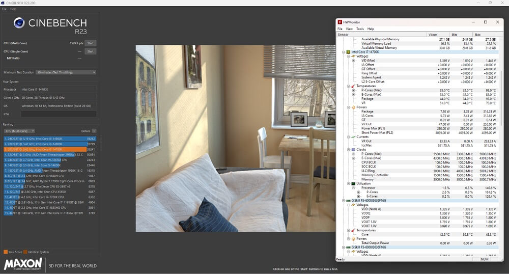 Với BIOS mặc định, điểm số cho ra khoảng ~35200 điểm, power package khoảng ~314W, nhiệt độ khoảng 93°C